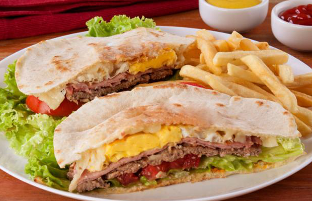 Picanha, presunto, queijo, ovo, bacon, salada e fritas media.